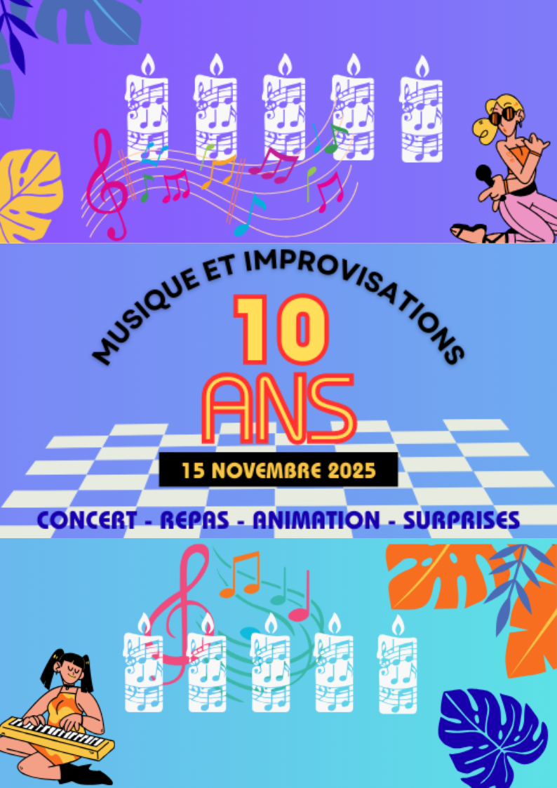 L’Association Musique et Improvisations fête ses 10 ans ! Rejoignez adhérents, élèves, professeurs et membres pour une soirée mémorable pleine de musique et de surprises. Réservez votre place - incluant le repas (adultes ou enfants) - dès maintenant !